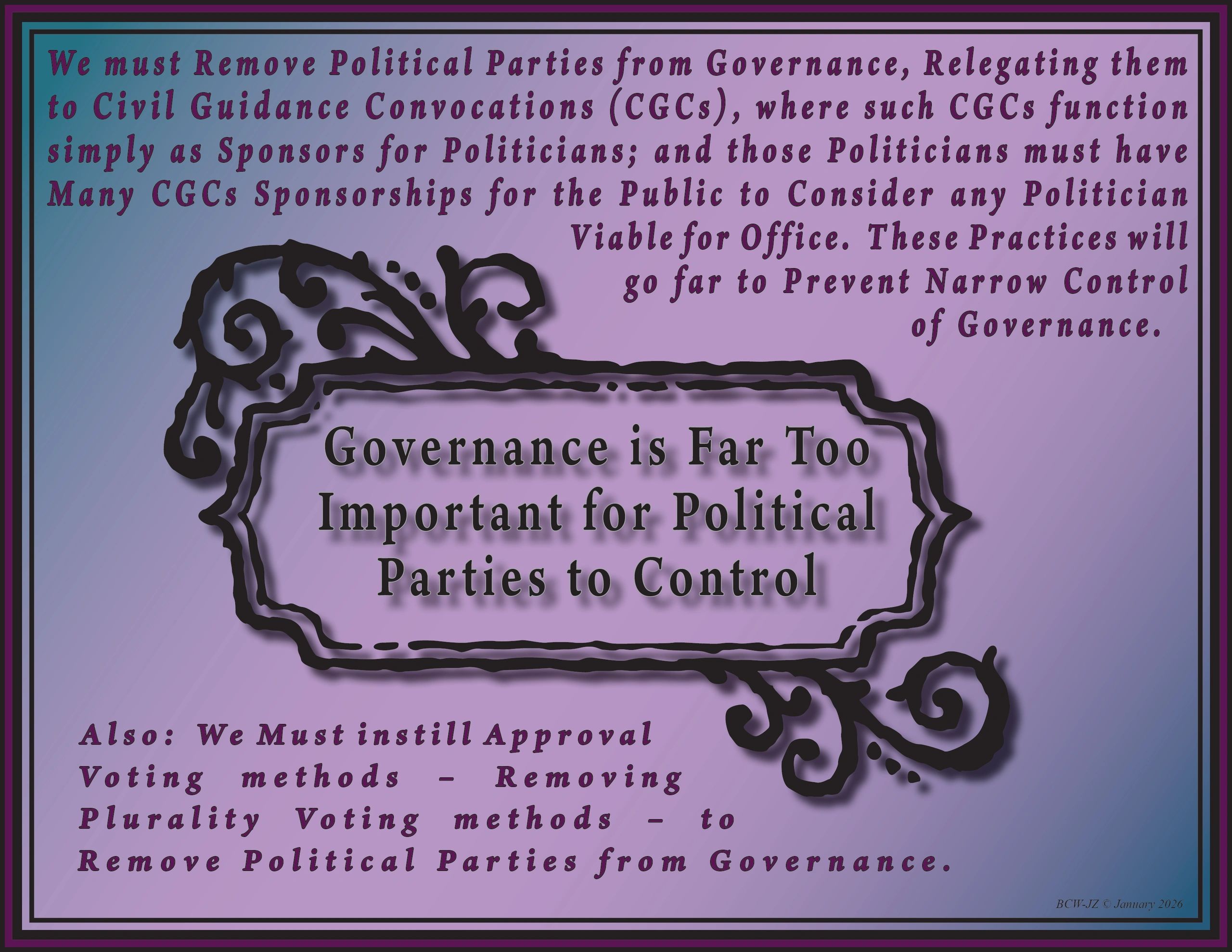 The nature of Political Parties makes them too dangerous to Control Governance. We, as Populations, are to bring Approval Voting methods to Democracies, disbanding Plurality Voting methods; as well as eliminating Primary Elections.